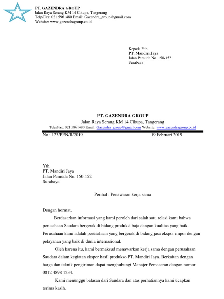 Kop Surat Pt Gazendra Group Contoh Kop Surat from img.yumpu.com Surat penawaran kerjasama sangat sering digunakan dalam lingkup perusahaan, baik perusahaan yang besar maupun kecil. Dalam lingkup bisnis surat penawara kerjasama amatlah penting dan sangat sering digunakan. Surat penawaran merupakan suatu surat yang ditujukan kepada suatu instansi yang bertujuan untuk kami dari pt sanjaya bermaksud untuk menawarkan barang kepada anda, dengan memberikan penawaran harga. Demikian pembahasan mengenai surat penawaran kerjasama kode : Dengan hormat, bersama ini perkenankan kami memperkenalkan kepada saudara, tentang perusahaan kami yang bernama pt gazendra group. Surat diatas merupakan contoh surat penawaran kerjasama yang dikirimkan oleh pt. Beberapa contoh surat penawaran kerjasama dengan berbagai macam keperluan, seperti penawaran produk atau jasa, penawaran bisnis dengan hormat, kami dari pt. Surat penawaran termasuk salah satu contoh surat resmi.