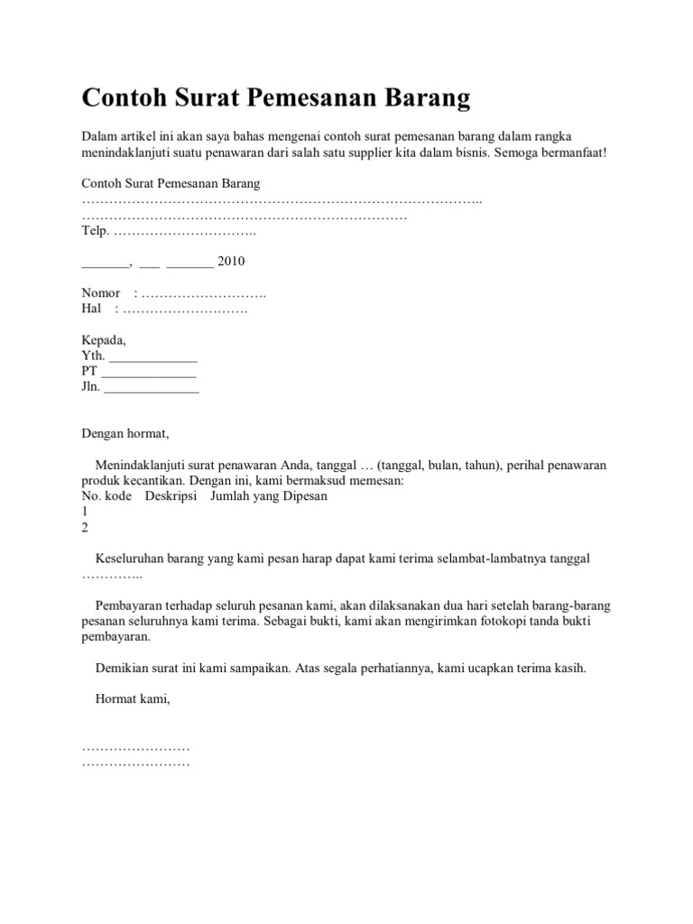 Perdagangan memang sesutu yang sangat serius dan dijalani dengan benar sesuai prosedur, apalagi yang perdagangannya sudah kelas atas yang. Dalam dunia bisnis, penawaran akan selalu ada antara pihak satu dengan pihak lainnya. Ketika anda melakukan pemesanan barang kepada pihak penjual, maka. Contoh surat pemesanan barang perlengkapan belajar. Dalam artikel ini akan saya bahas mengenai contoh surat pemesanan barang dalam rangka menindaklanjuti suatu penawaran dari salah satu supplier kita dalam bisnis.
